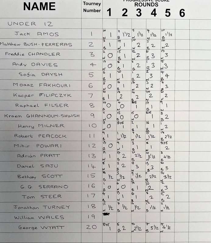 U12: 1st* George Wyatt 4½/5; 2nd* AD Pratt 4½/5; 3rd Sofia Daysh 4/5
