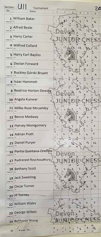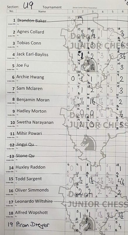 • DEVON SCHOOLS’ U11 & U9 TEAM CHAMPIONSHIPS: Team lists of 5 players from the same school to be handed in by the start of round 2. The scores of the 5 players will be totalled at the end to find the school champions in the U11 and U9 sections.