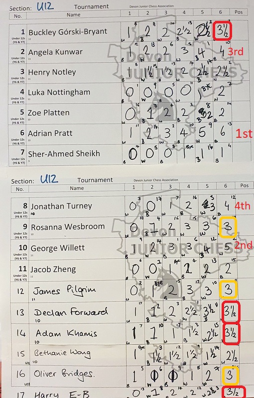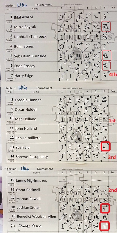 U14: 1st 4½/6 Mac Holland, 2nd Oscar Pocknell 4/6, 3rd 4/6 Shreyas Pasupalety, 4th 4/6 Harry Edge
