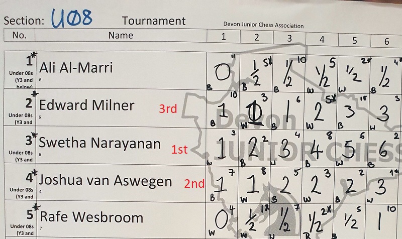 U08: 1st 6/6 Swetha Narayanan, 2nd 3/6 Joshua van Anwegen 3rd 3/6 Edward Milner