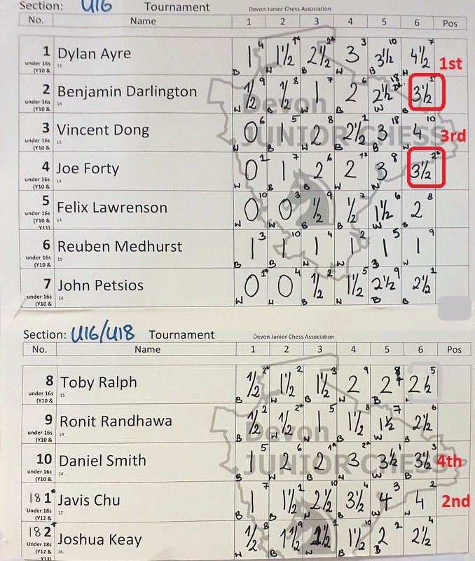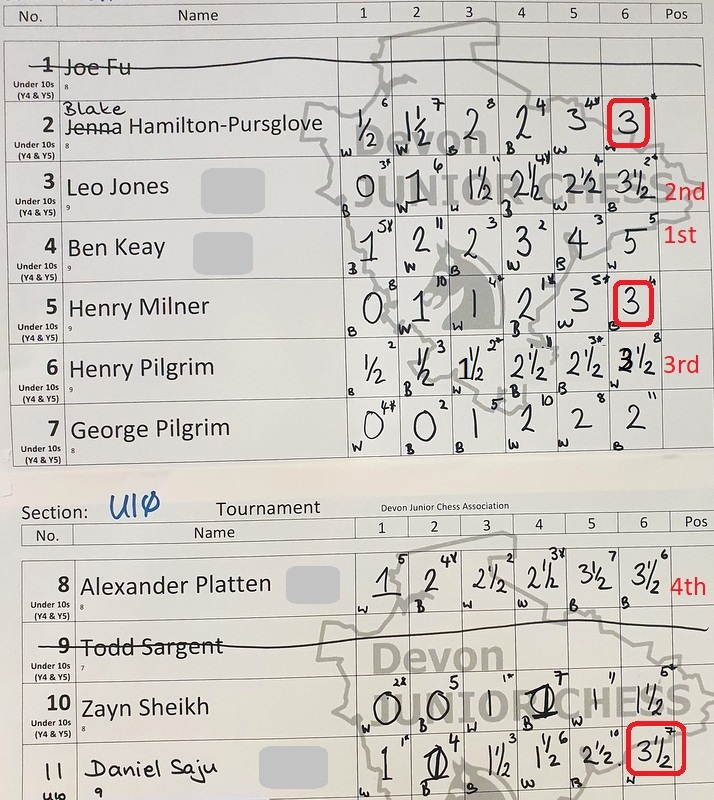 U10: 1st 5/6 Ben Keay, 2nd 3½ Leo Jones, 3rd 3½ Henry Pilgrim, 4th 3½ Alexander Platten